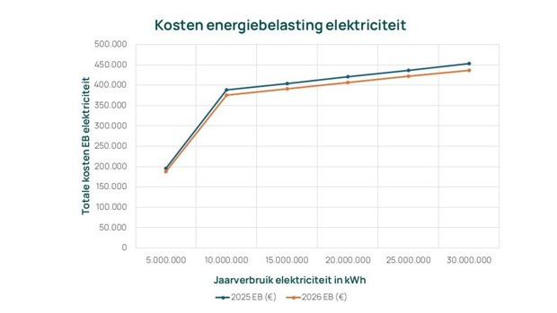 Bij een jaarlijks elektriciteitsverbruik van circa 25 miljoen kWh liggen de energiebelastingkosten in 2026 ongeveer € 15.000 lager dan in 2025. Boven de grens van 10 miljoen kWh stijgen de energiebelastingkosten nog maar beperkt, omdat het tarief per extra kWh dan laag is.