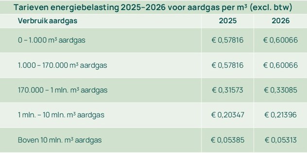 Tabel 1: Tarieven energiebelasting per m3 aardgas 2025-2026 (excl BTW)
